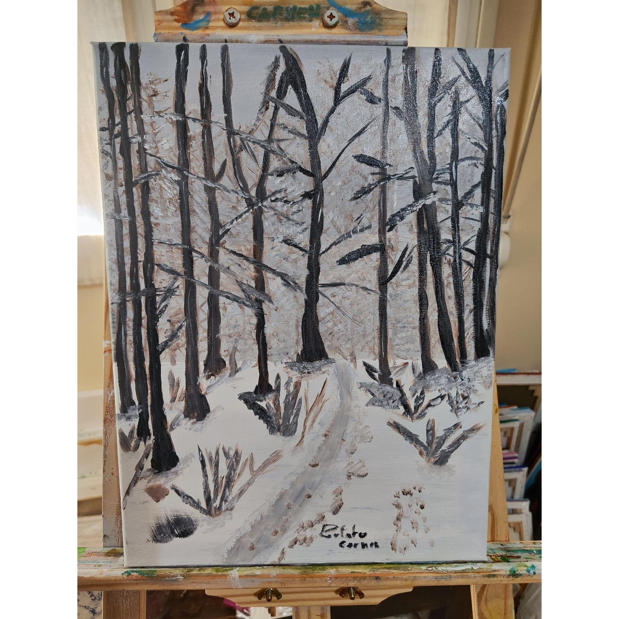 Mi piacciono i paesaggi innevati e mi sono ricordata di questo bosco nel periodo invernale, sono affascinata da questo dipinta, e una dei miei dipinti invernali, questo ad olio. e un quadro molto lavorarto, per uno sfon che appena si intravede di motissimi alberi , che sono dipipinti uno ad uno, il quadro a la tecnica classica del dipinto a olio, questo perchè ho voluto raffinare il quadro, e andato diverso tempo per farlo, ma mi ha soddisfata come paesaggio, per me il quadro rappresenta un luogo dove da ragazza di inverno mi andavo rifugiare per rillassarmi riprendere energie e meditare, spesso nella natura ti aiuta a trovare le le soluzione con le loro energie
