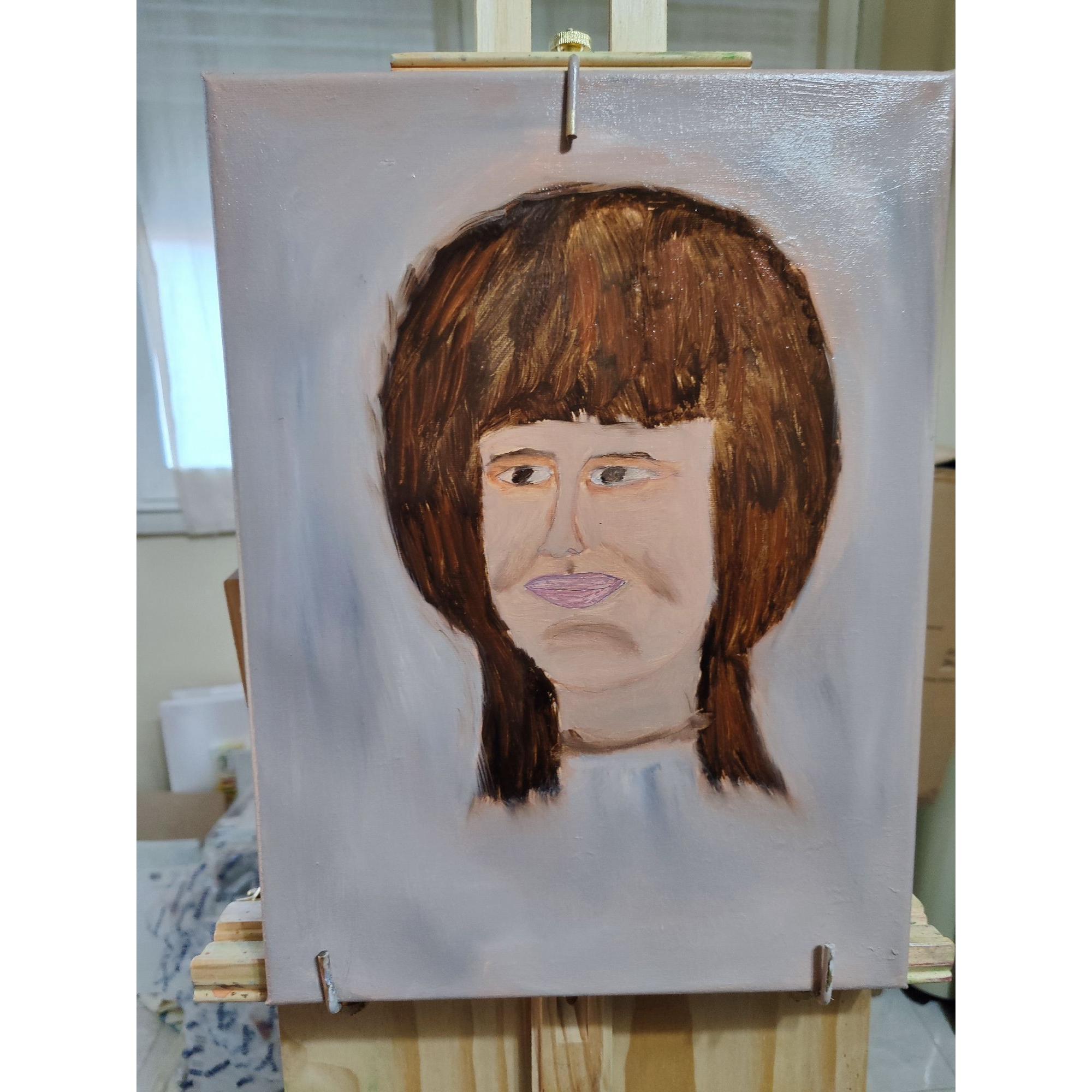 Il dipinto nasce il giorno di natale, sono sola, prendo una tela e traccio dapprima le linee per un viso di scorcio, poi la rifinisco a mano fino a formare quel viso femminile, e dando le varie forme ecc, poi passo alla pittura, nasce in monocolore marrone, non mi piace lo sfondo che viene cambiato infine applico quello che mi ha insegnato la prof. di artistica il viso non deve essere realistico ma artistico, espressionistico