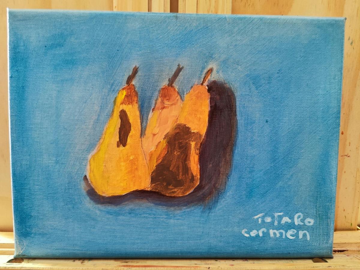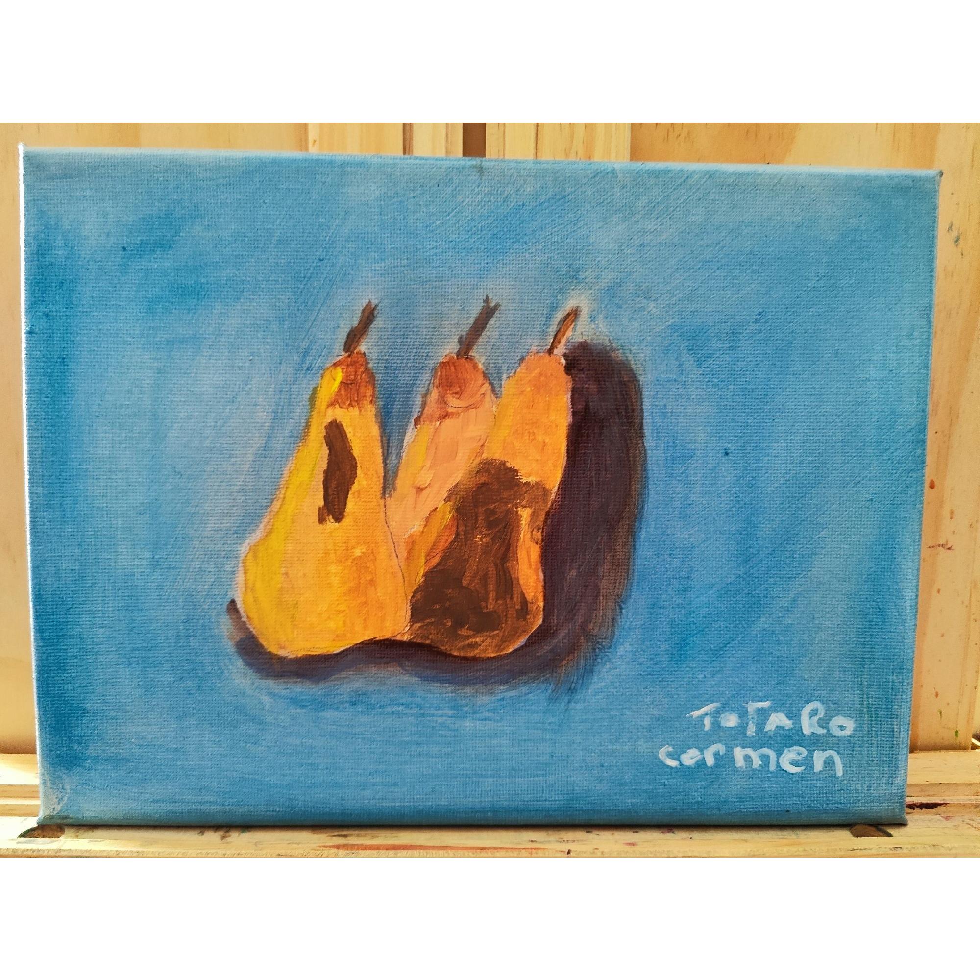 Questo dipinto nasce insieme a Natalina, il giorno di natale, volevo fare dei dipinti diversi non impegnativi e divertenti, mi sono cimentata in questa piccola tela, non avendo mai dipinto le pere, così le ho fatte
