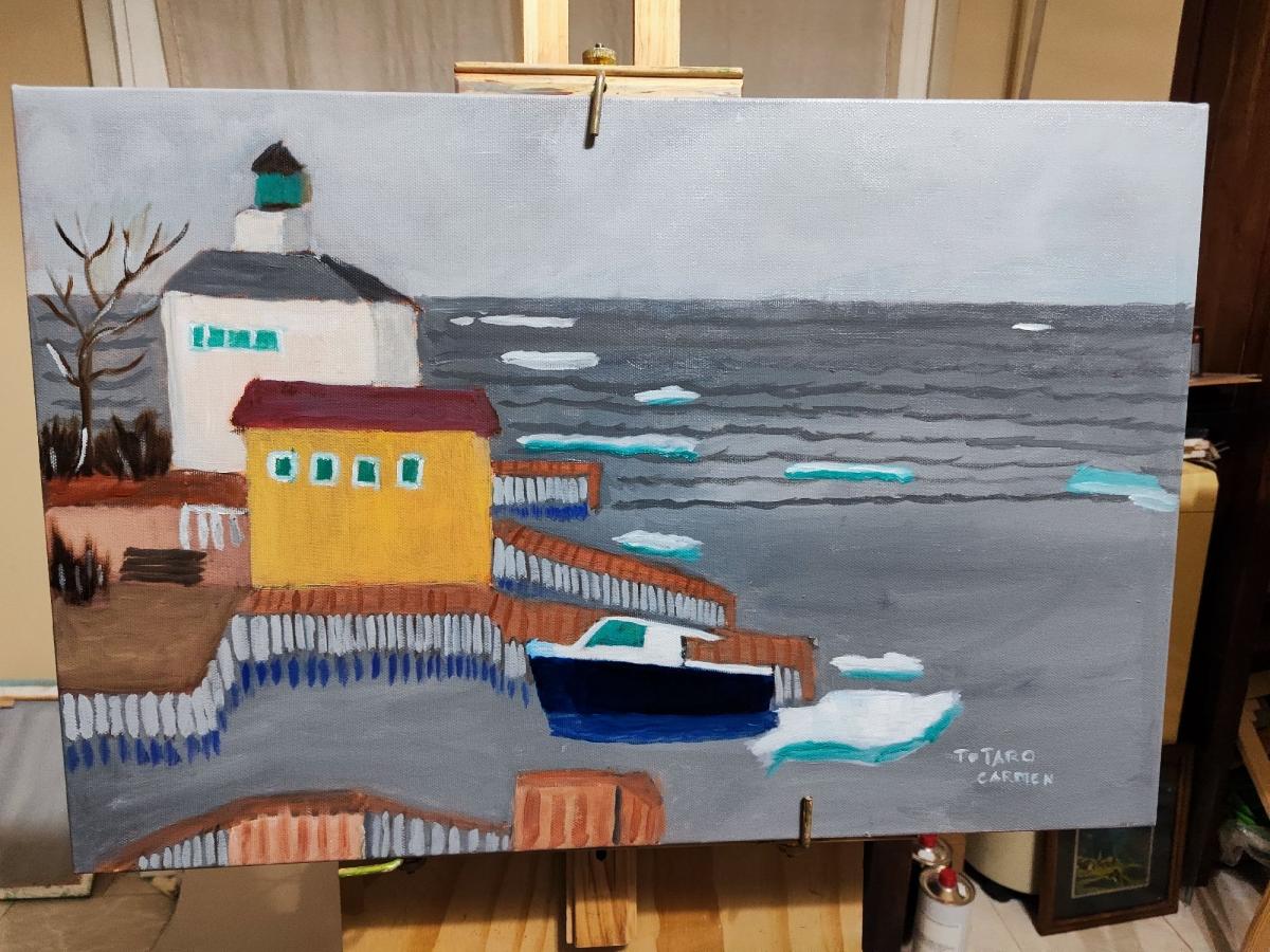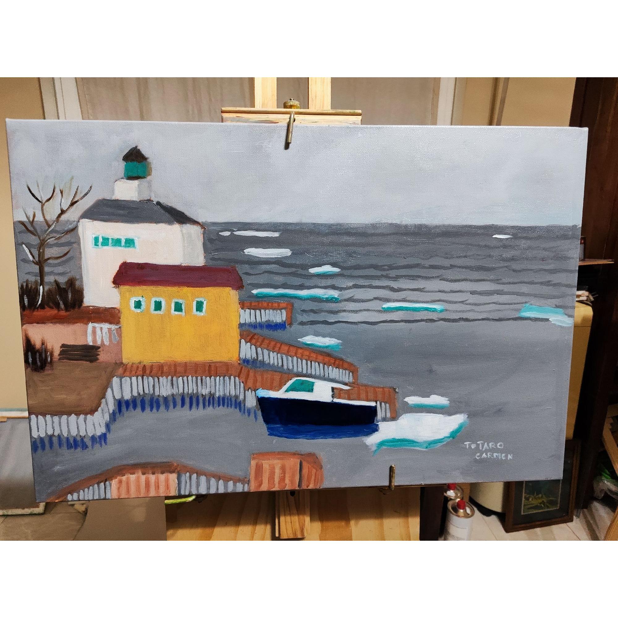 Il dipinto riprende in modo stilizzato un piccolo porto con faro di Terranova, con mare nel periodo invernale, sono riportate masse di ghiaccio vagante e una formazione nebbiosa, come riportato nel dipinto, con giornata uggiosa