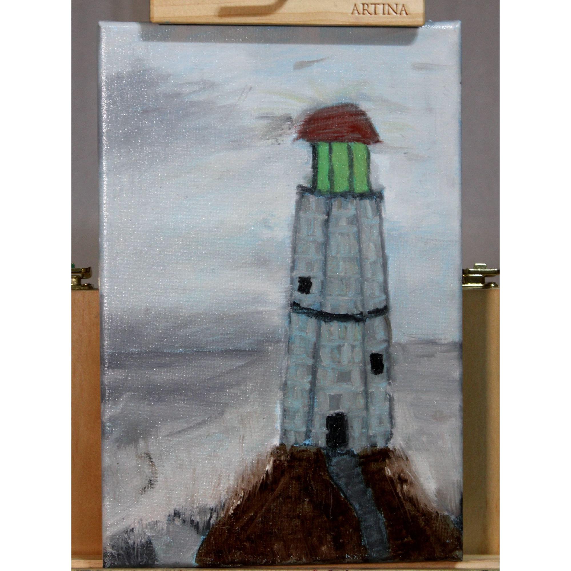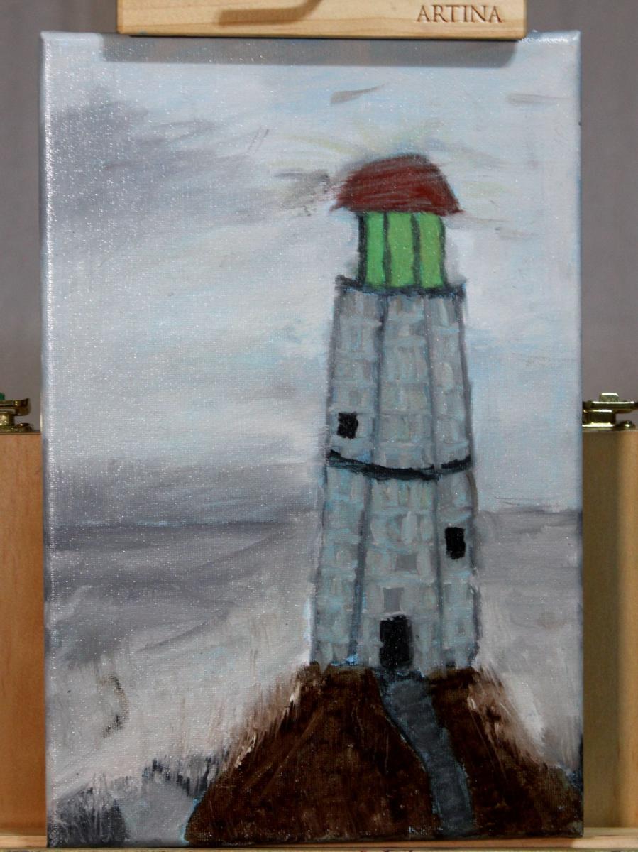 Il dipinto riprende un faro della costazzurra nella tempesta, stizzato, quando ho visto l'immagine che mi si prentava ho deciso di metterlo su una piccola tela, i colore predominate e il grigio, con bianco, rosso e verde