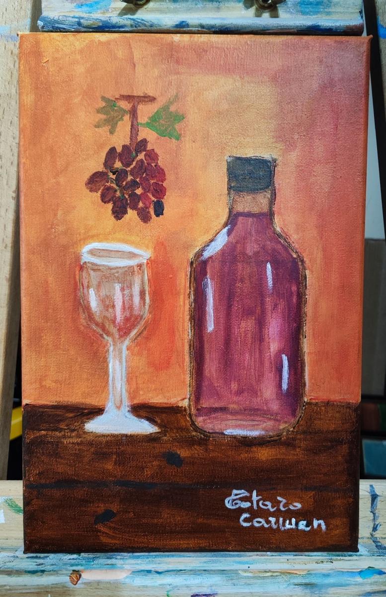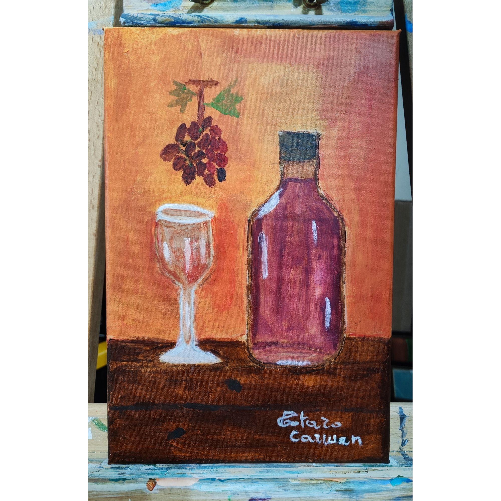 Il dipinto come vedete rappresenta una natura morta, la bottiglia di vino e un bicchiere appoggiato su un tavolo di legno, con un grappolo di uva dipinto sul muro
