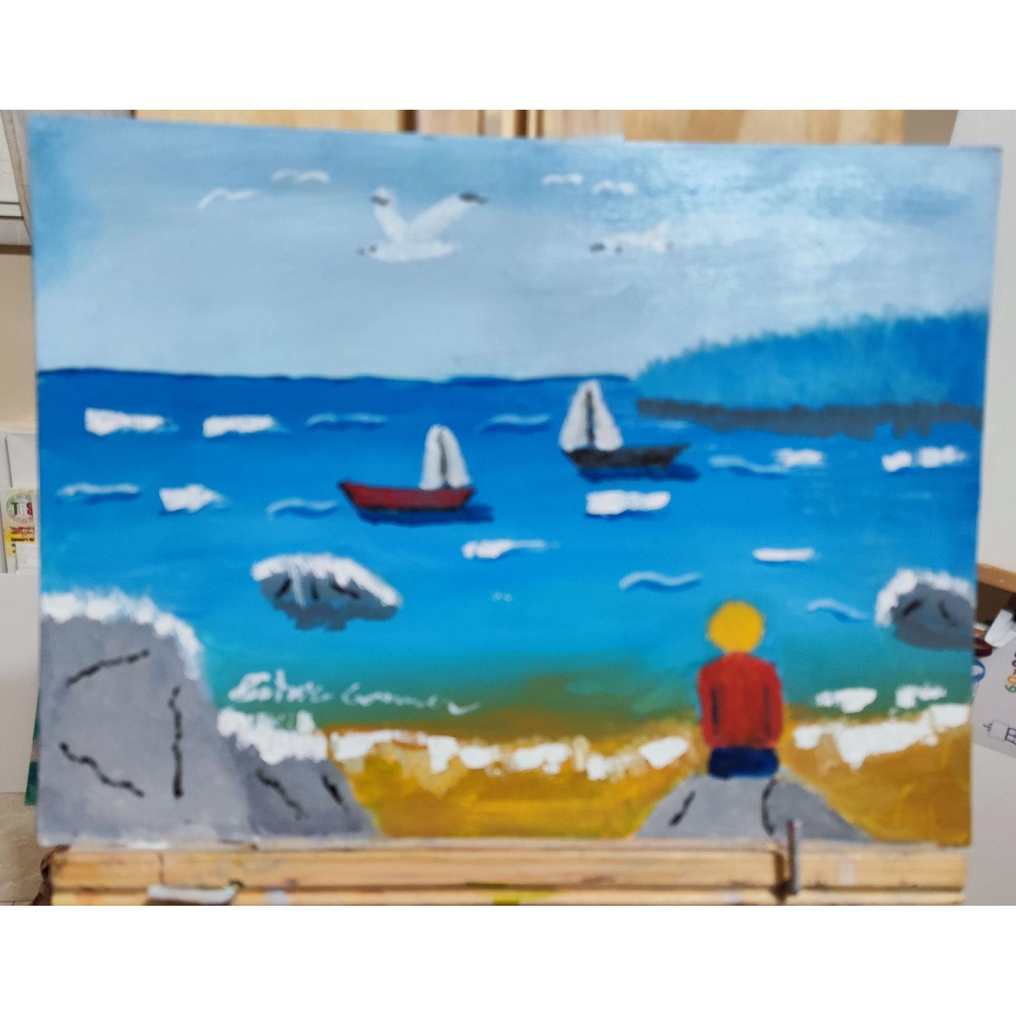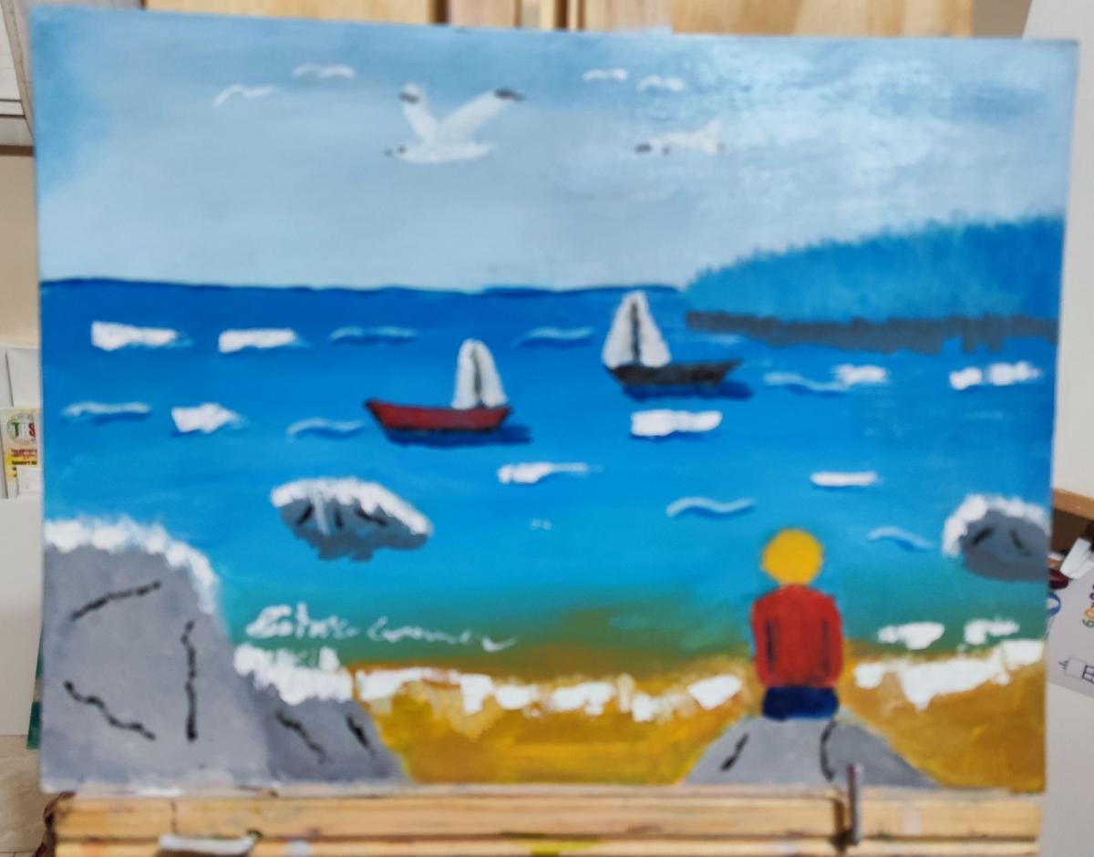 Il dipinto riprende la mia immaginazione di essere al mare, mi trovo immersa nella sua natura, seduta ad osservare il mare e in balia delle due forze energetiche, dai gabbiani con il loro volo maestoso, il.loro giocare e strillare, al suono delle acque che vengono a infrangersi sulla spiaggia, alle due barchette a vela che sono spinte dal leggero vento, e all' isola lussureggiante in lontananza, mi sembra di vivere nel mio sogno